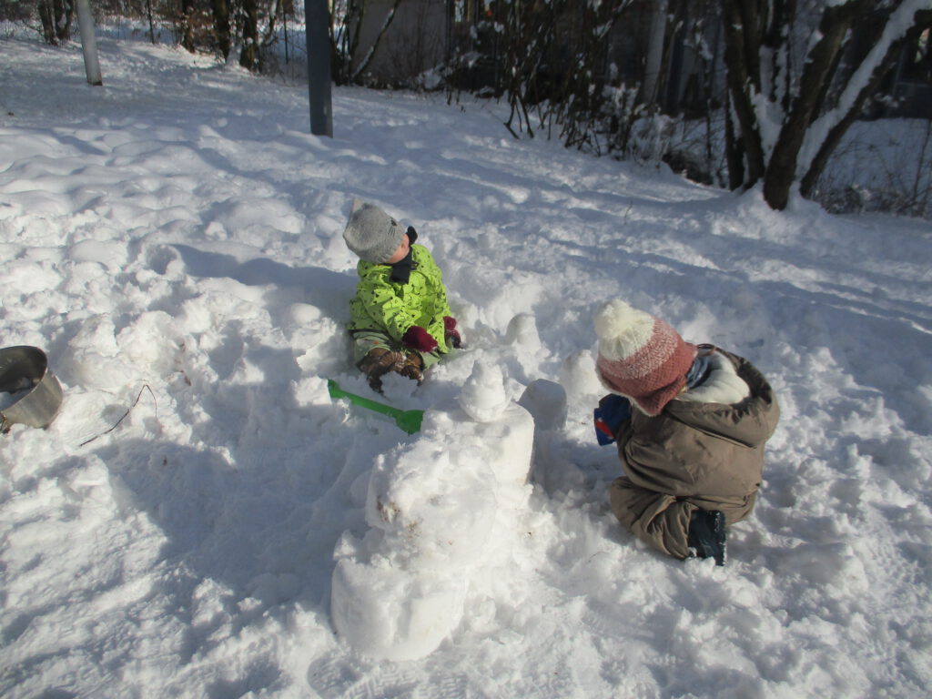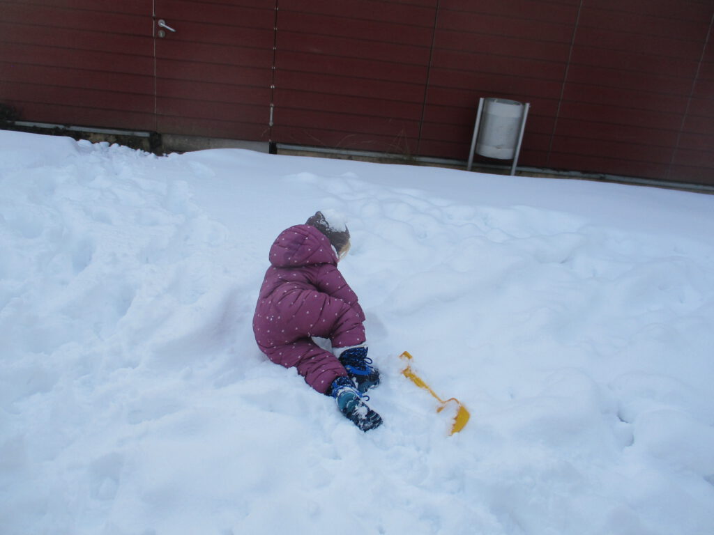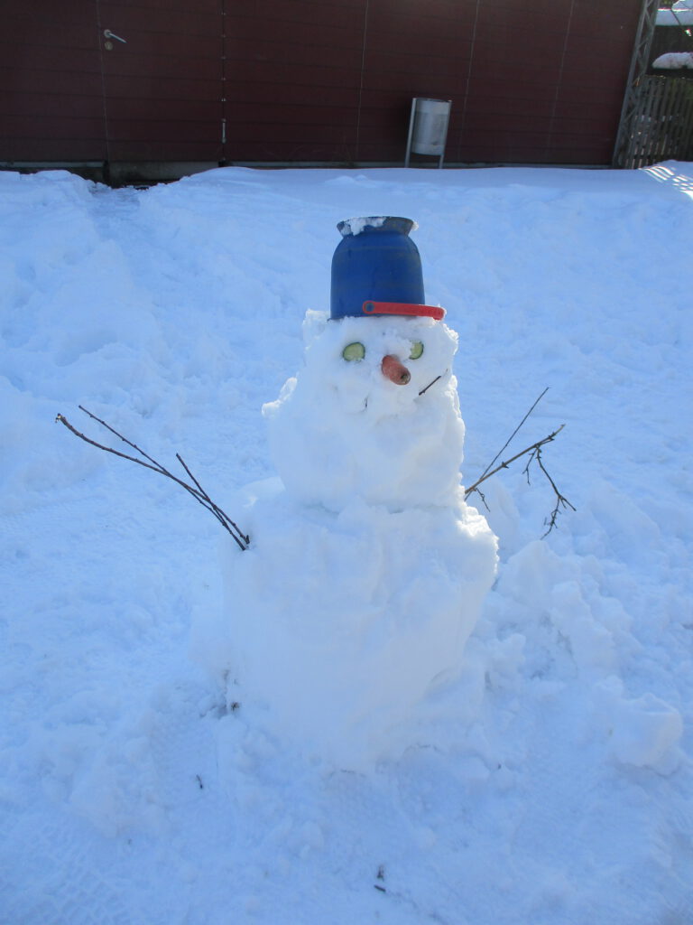 Wir tollen ausgelassen im Schnee herum, bauen eine Mauer für ein Iglu und unterschiedlichste Schneefiguren.